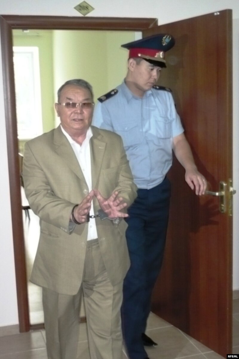 Полиция облыс әкімінің бұрынғы кеңесшісі Алпамыс Бектұрғановты үкім шыққаннан кейін сот залынан әкетіп бара жатыр. Орал, 13 тамыз, 2009 жыл.