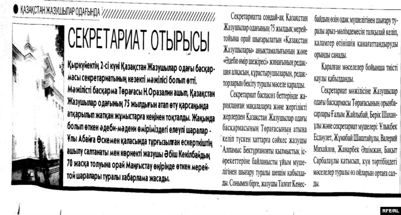 Жазушы Алпамыс Бектұрғановтың Қазақстан Жазушылар Одағының мүшелігінен шығарылғаны туралы «Қазақ әдебиеті» газетінде басылған ақпарат. Алматы, 4 қыркүйек 2009 жыл.