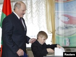 Беларусь президенті Александр Лукашенко ұлы Николаймен бірге президент сайлауында дауыс беріп тұр. Минск, 19 желтоқсан 2010 жыл.