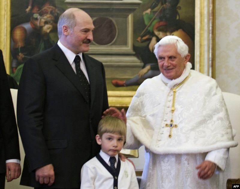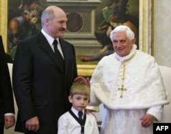 Беларусь президенті Александр Лукашенко ұлы Николаймен бірге Рим папасы XVI Бенедиктпен кездесуде. Ватикан, 27 сәуір 2009 жыл.