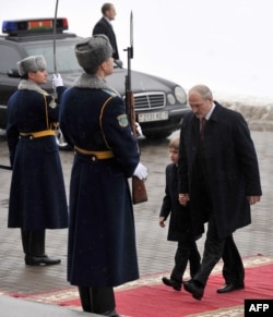 Беларусь президенті Александр Лукашенко ұлы Николаймен бірге Республика сарайындағы салтанатқа келе жатыр. Минск, 21 қаңтар 2011 жыл.