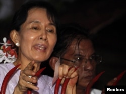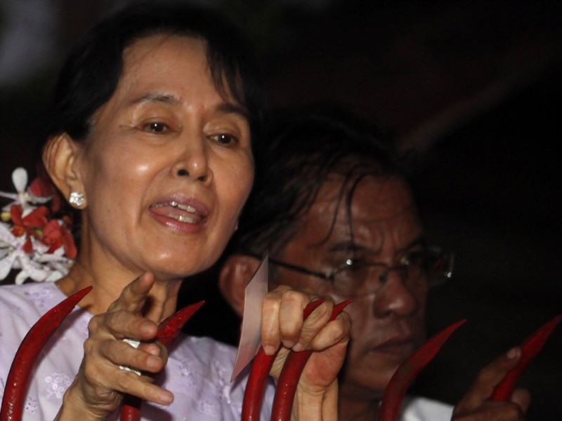Мьянма оппозициясының жетекшісі Аунг Сан Суу Кий үйқамақтан босаған соң өз жақтастарымен жүздесіп тұр. Янгон, 13 қараша 2010 жыл.